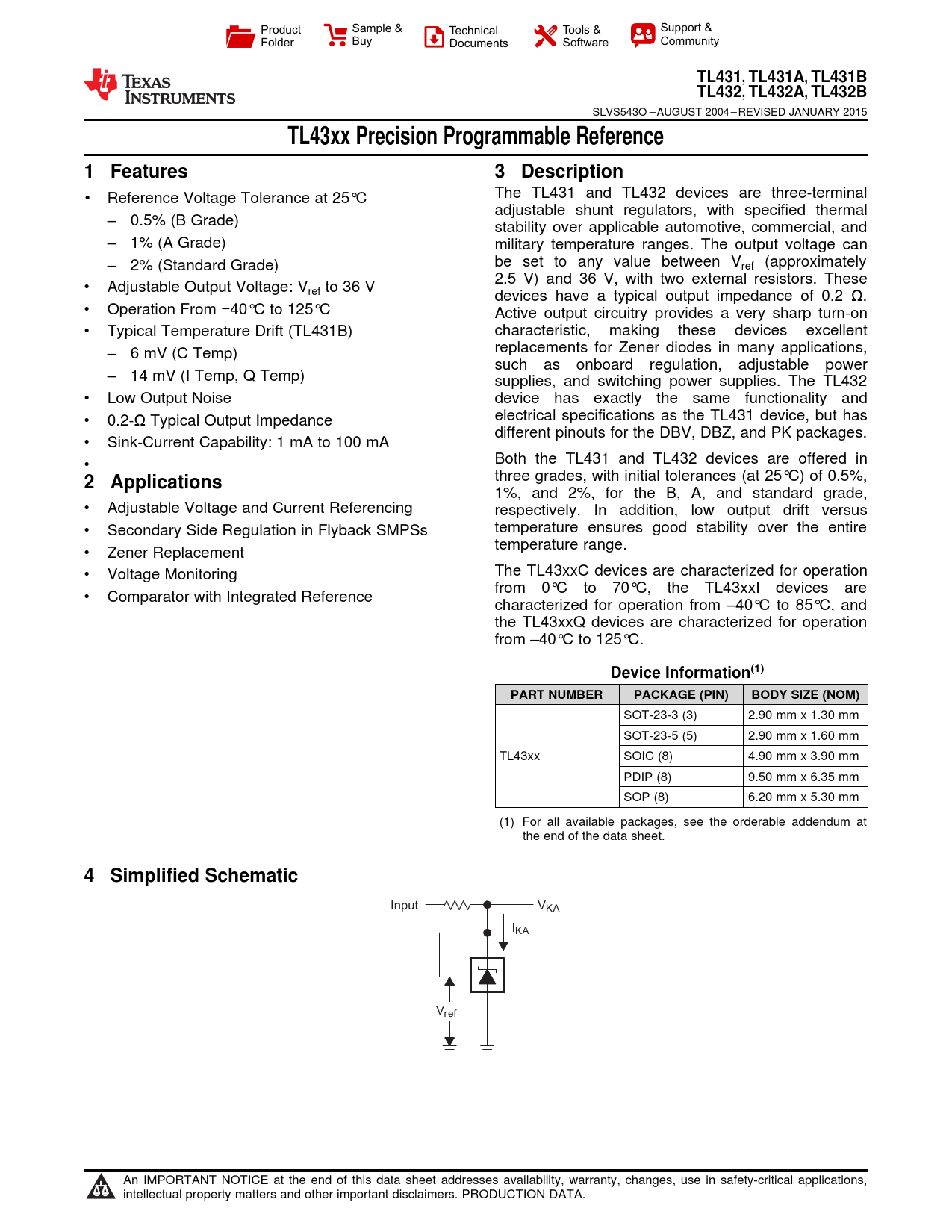 TL431. , TL431A,. TL431B. TL432. , TL432A,. TL432B. TL43xx Precision Programmable Reference. 1 Features. 3 Description. 2 Applications