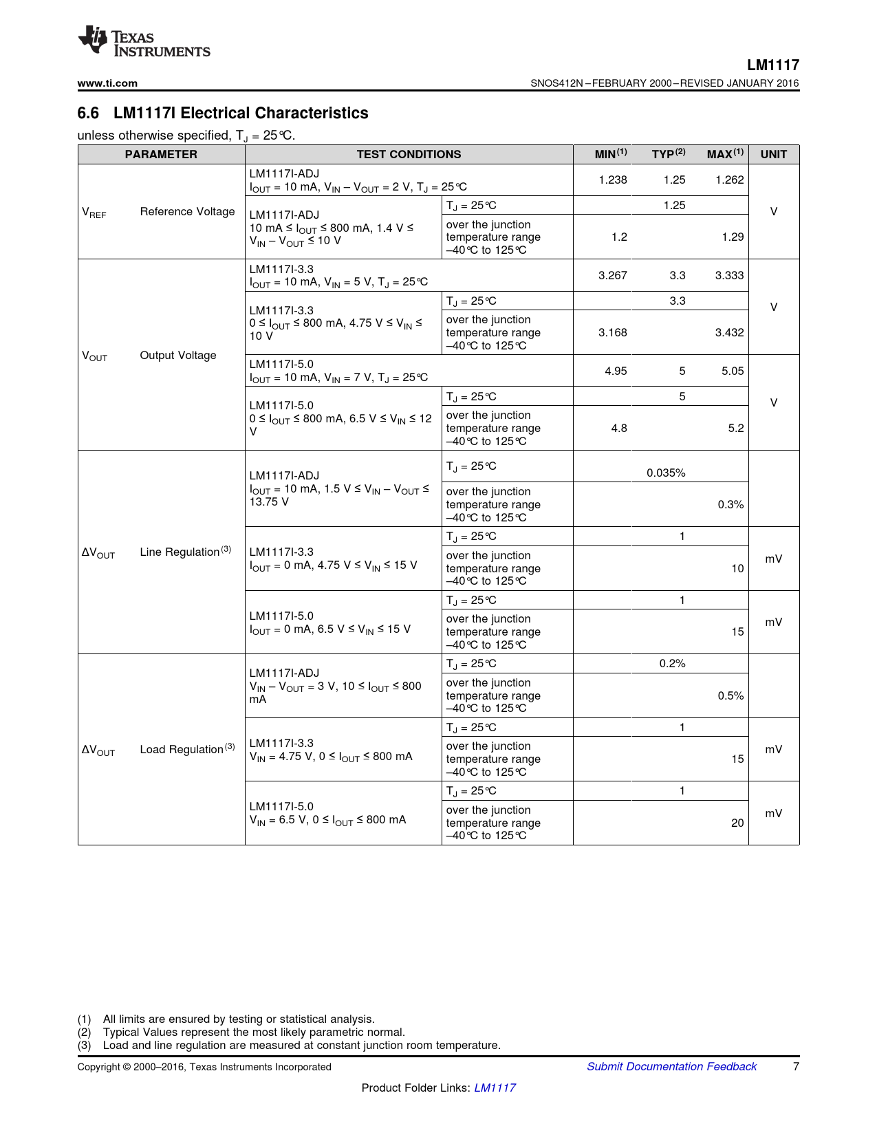LM1117. www.ti.com. 6.6 LM1117I Electrical Characteristics. PARAMETER. TEST CONDITIONS. MIN(1). TYP(2). MAX(1). UNIT