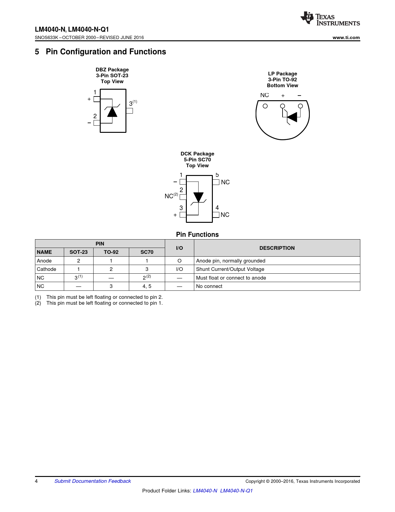 | Páginas / Página | 71 / 4 — LM4040-N,. LM4040-N-Q1. www.ti.com. 5 Pin Configuration and Functions. … |