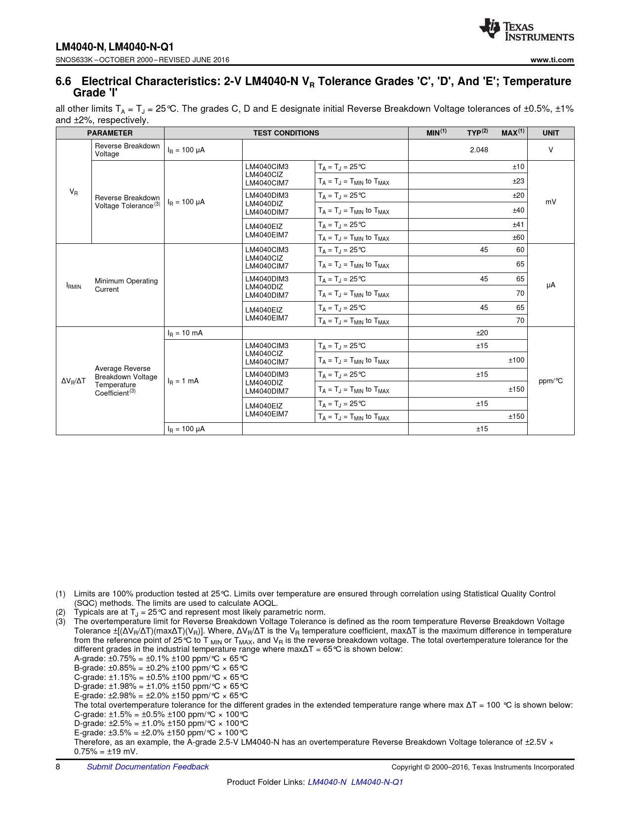 www.ti.com 6.6 Electrical Characteristics: 2-V LM4040-N VR Tolerance Grades 'C', 'D', And 'E'; Temperature Grade 'I'