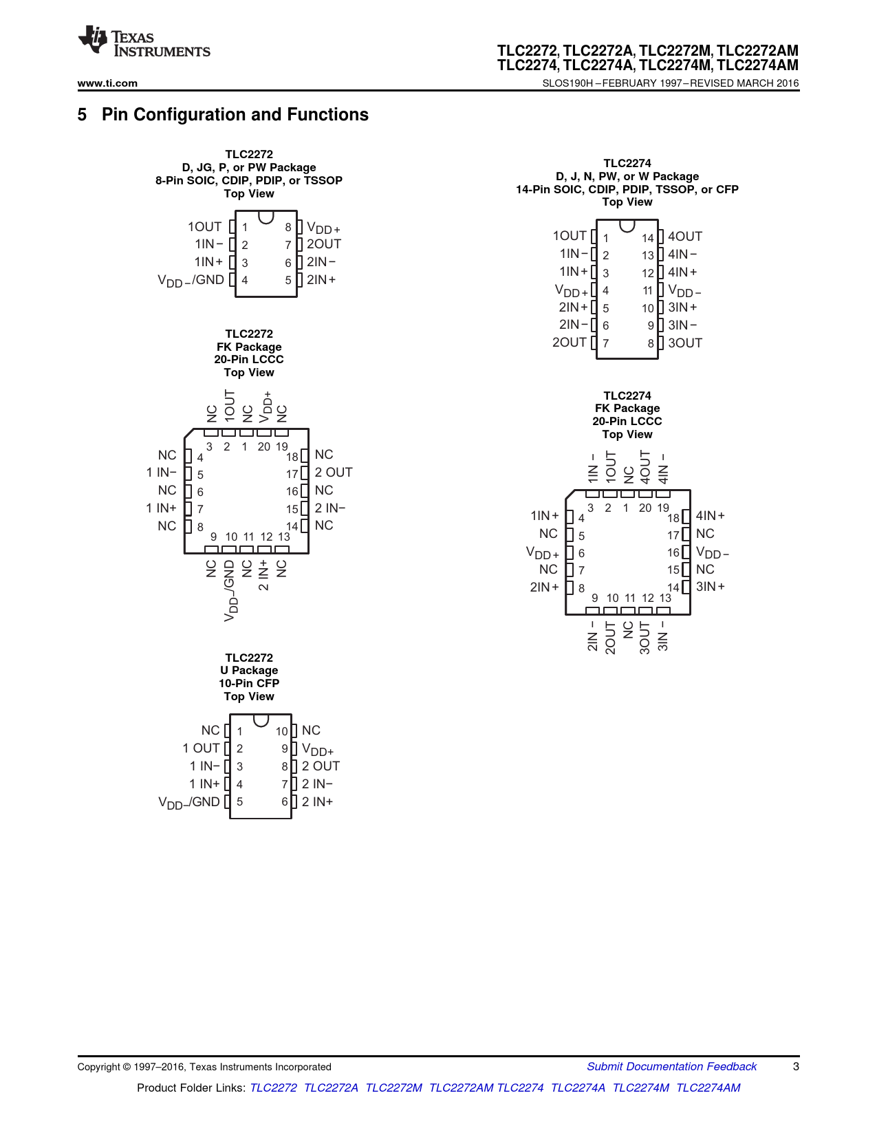 TLC2272. , TLC2272A,. TLC2272M. , TLC2272AM. TLC2274. , TLC2274A,. TLC2274M. , TLC2274AM. www.ti.com. 5 Pin Configuration and Functions