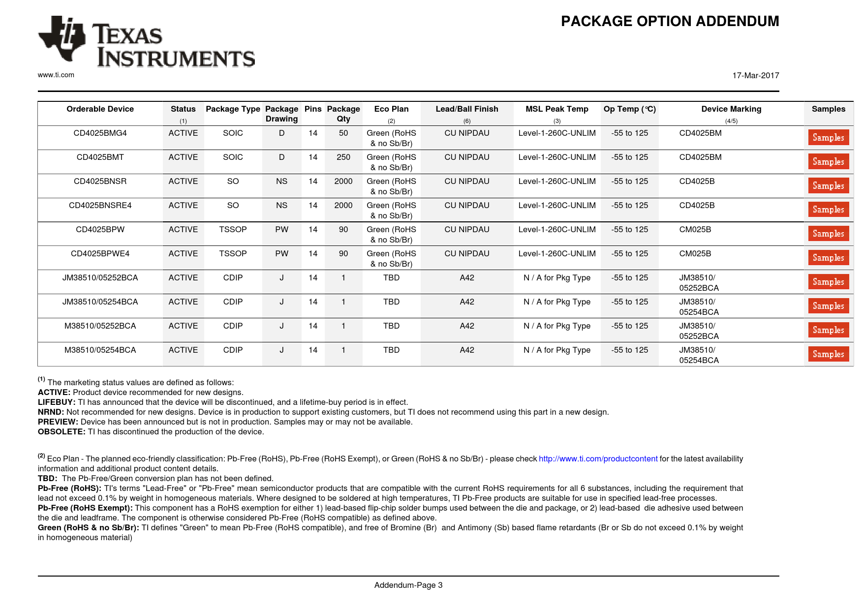 (2) (6) (3) (4/5) CD4025BMG4 ACTIVE SOIC D 14 50 Green (RoHS CU NIPDAU Level-1-260C-UNLIM -55 to 125 CD4025BM & no Sb/Br) CD4025BMT ACTIVE SOIC D 14 250 Green (RoHS CU NIPDAU Level-1-260C-UNLIM -55 to 125 CD4025BM & no Sb/Br) CD4025BNSR ACTIVE SO NS 14 2000 Green (RoHS CU NIPDAU Level-1-260C-UNLIM -55 to 125 CD4025B & no Sb/Br) CD4025BNSRE4 ACTIVE SO NS 14 2000 Green (RoHS CU NIPDAU Level-1-260C-UNLIM -55 to 125 CD4025B & no Sb/Br) CD4025BPW ACTIVE TSSOP PW 14 90 Green (RoHS CU NIPDAU Level-1-260C-UNLIM -55 to 125 CM025B & no Sb/Br) CD4025BPWE4 ACTIVE TSSOP PW 14 90 Green (RoHS CU NIPDAU Level-1-260C-UNLIM -55 to 125 CM025B & no Sb/Br) JM38510/05252BCA ACTIVE CDIP J 14 1 TBD A42 N / A for Pkg Type -55 to 125 JM38510/ 05252BCA JM38510/05254BCA ACTIVE CDIP J 14 1 TBD A42 N / A for Pkg Type -55 to 125 JM38510/ 05254BCA M38510/05252BCA ACTIVE CDIP J 14 1 TBD A42 N / A for Pkg Type -55 to 125 JM38510/ 05252BCA M38510/05254BCA ACTIVE CDIP J 14 1 TBD A42 N / A for Pkg Type -55 to 125 JM38510/ 05254BCA