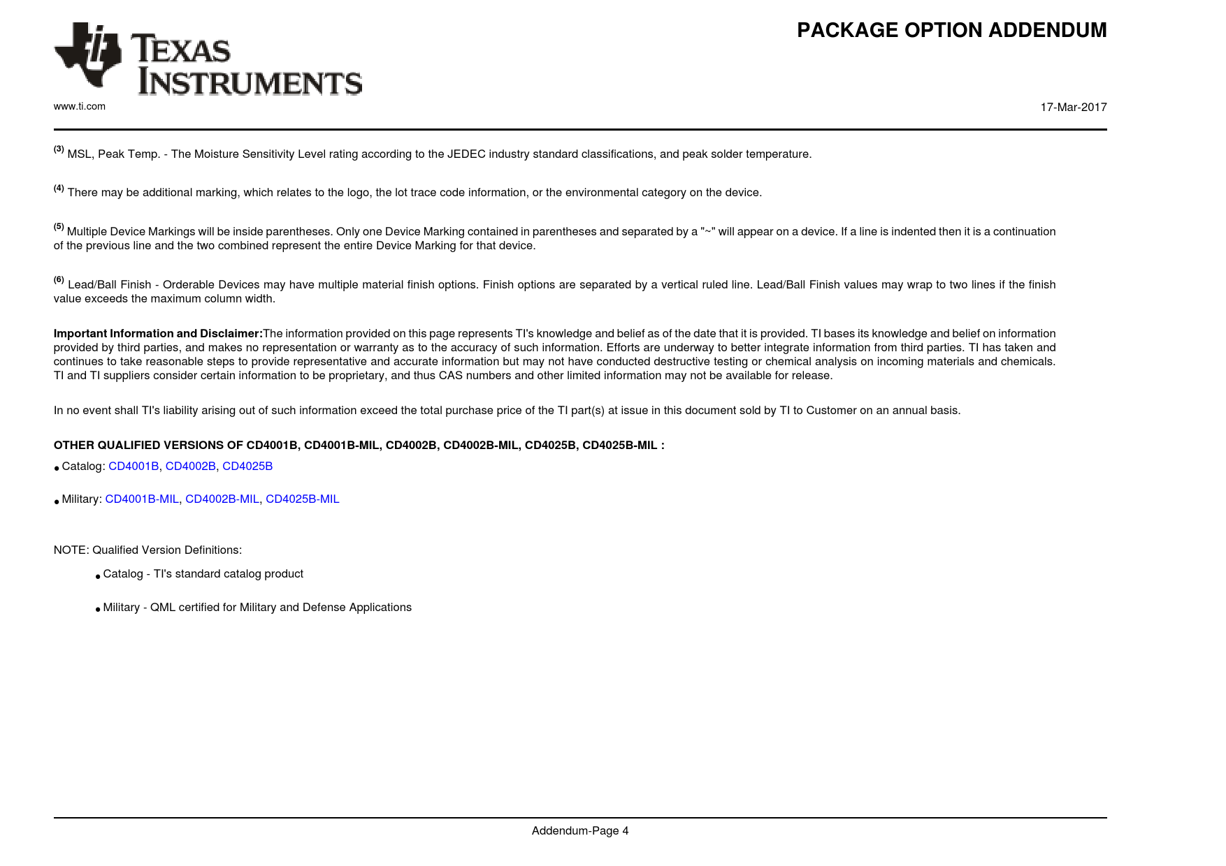 • Catalog: CD4001B, CD4002B, CD4025B • Military: CD4001B-MIL, CD4002B-MIL, CD4025B-MIL NOTE: Qualified Version Definitions: • Catalog - TI's standard catalog product • Military - QML certified for Military and Defense Applications Addendum-Page 4