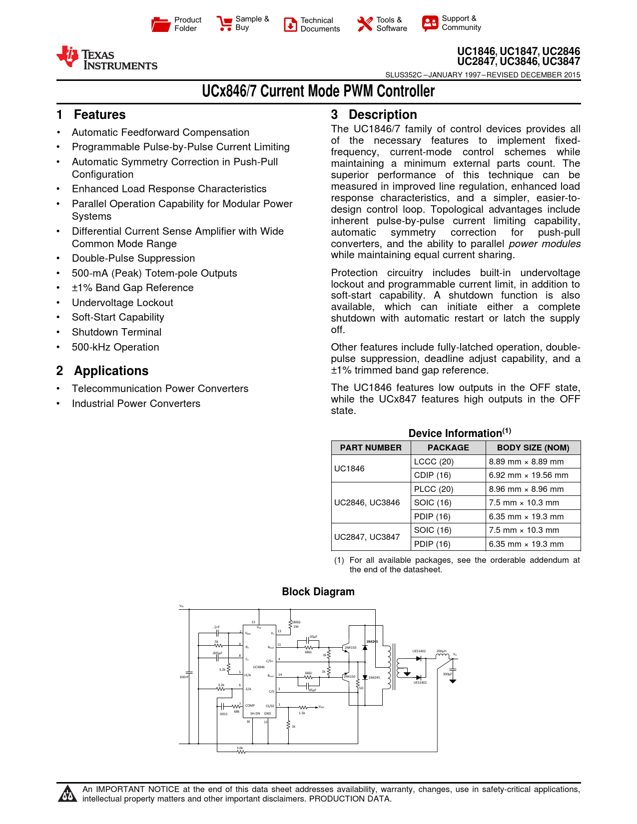 UC1846,. UC1847. , UC2846. UC2847,. UC3846. , UC3847. UCx846/7 Current Mode PWM Controller. 1 Features. 3 Description. 2 Applications