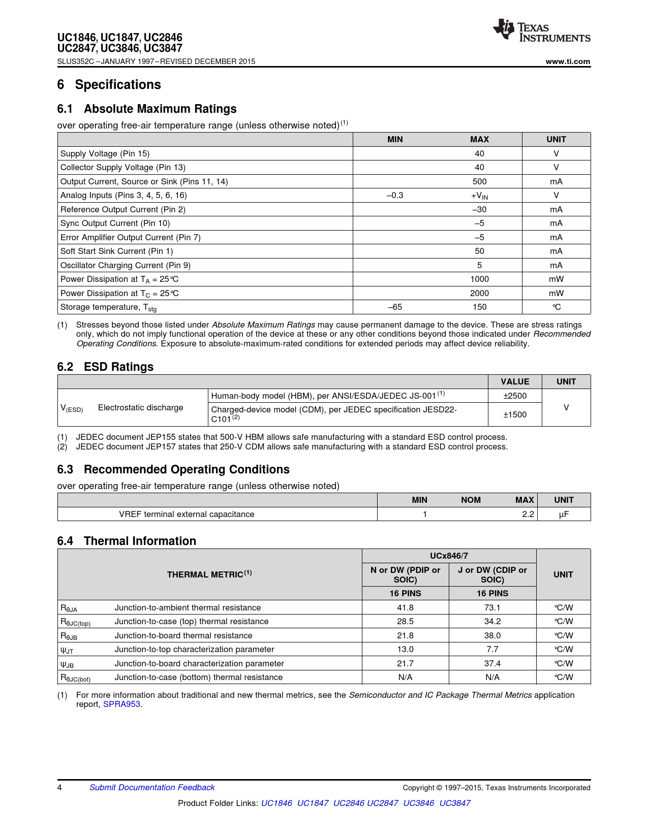 UC1846,. UC1847. , UC2846. UC2847,. UC3846. , UC3847. www.ti.com. 6 Specifications. 6.1 Absolute Maximum Ratings. MIN. MAX. UNIT