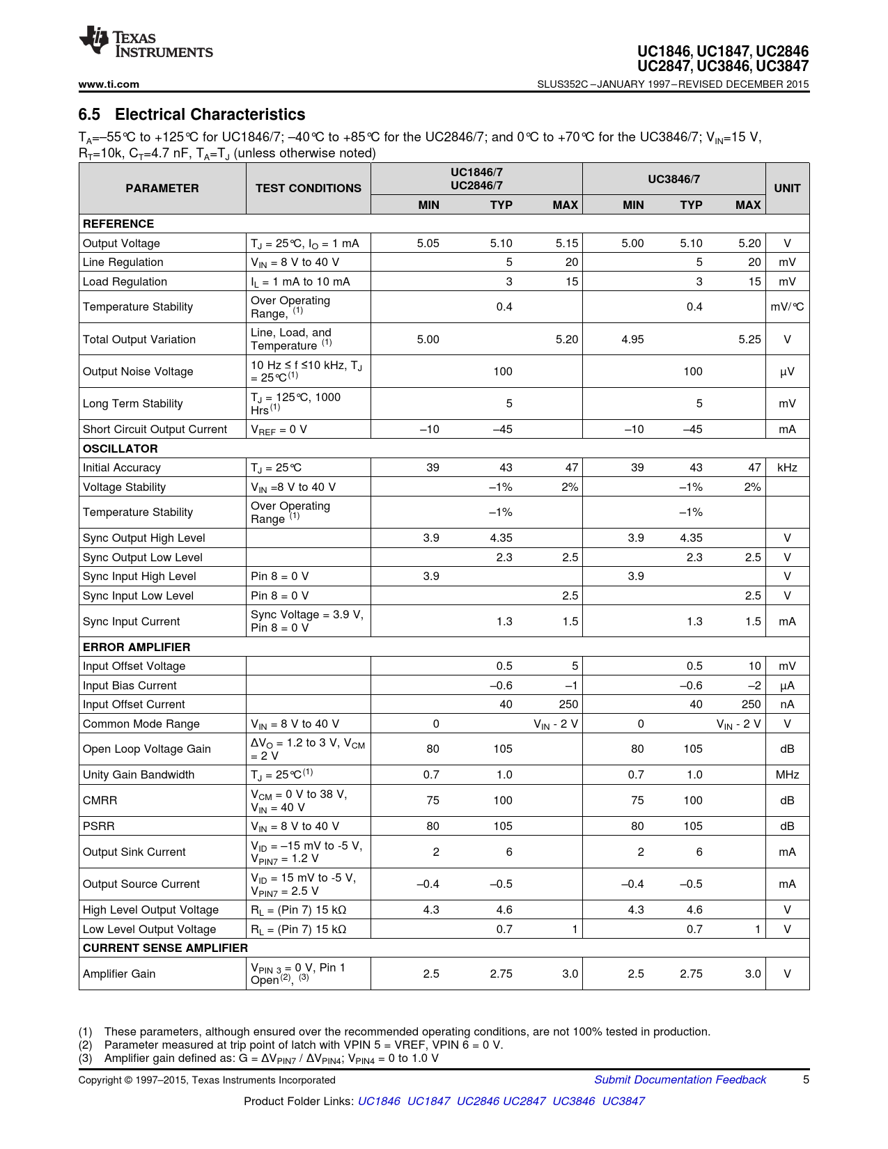 UC1846,. UC1847. , UC2846. UC2847,. UC3846. , UC3847. www.ti.com. 6.5 Electrical Characteristics. UC1846/7. UC3846/7. UC2846/7. PARAMETER