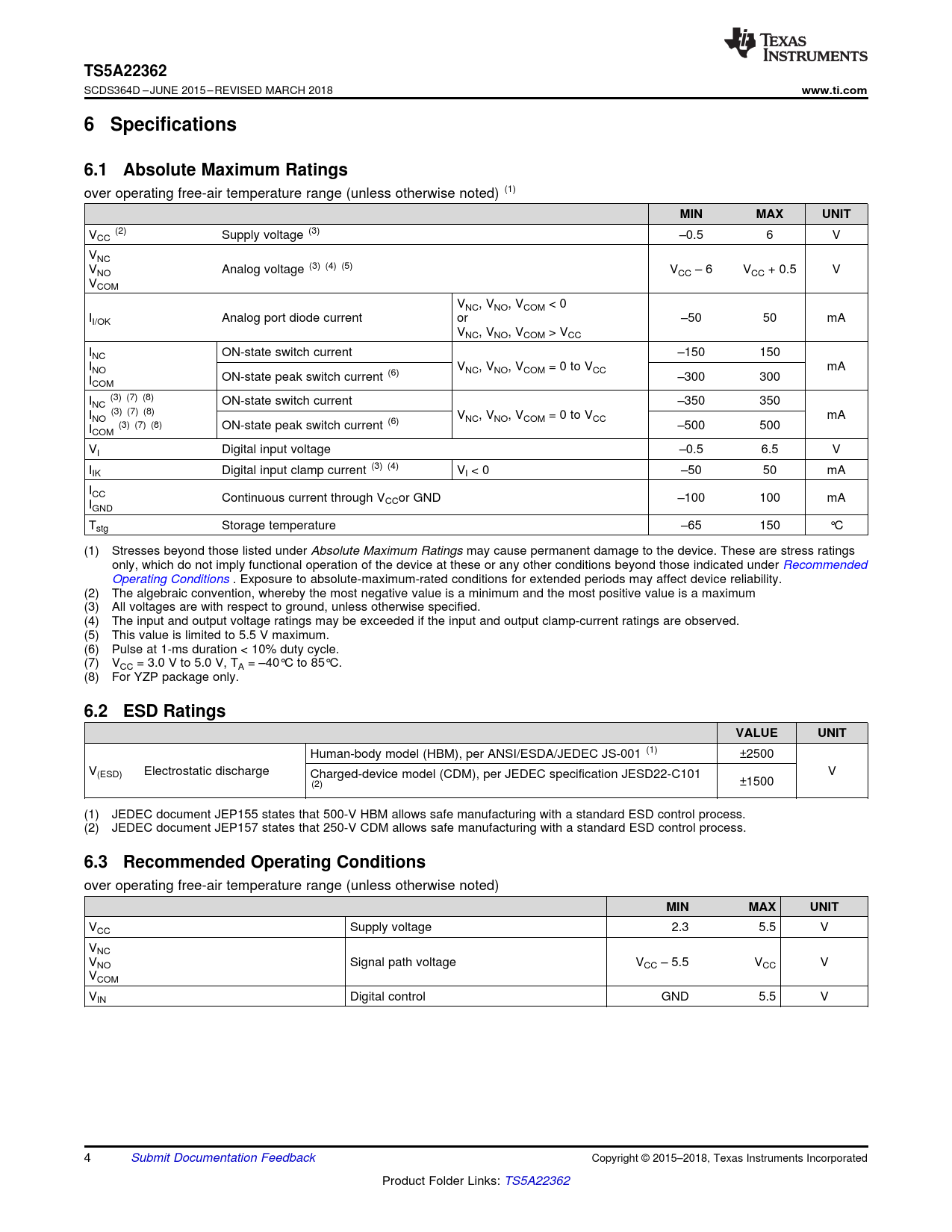 TS5A22362. www.ti.com. 6 Specifications. 6.1 Absolute Maximum Ratings. MIN. MAX. UNIT. 6.2 ESD Ratings. VALUE