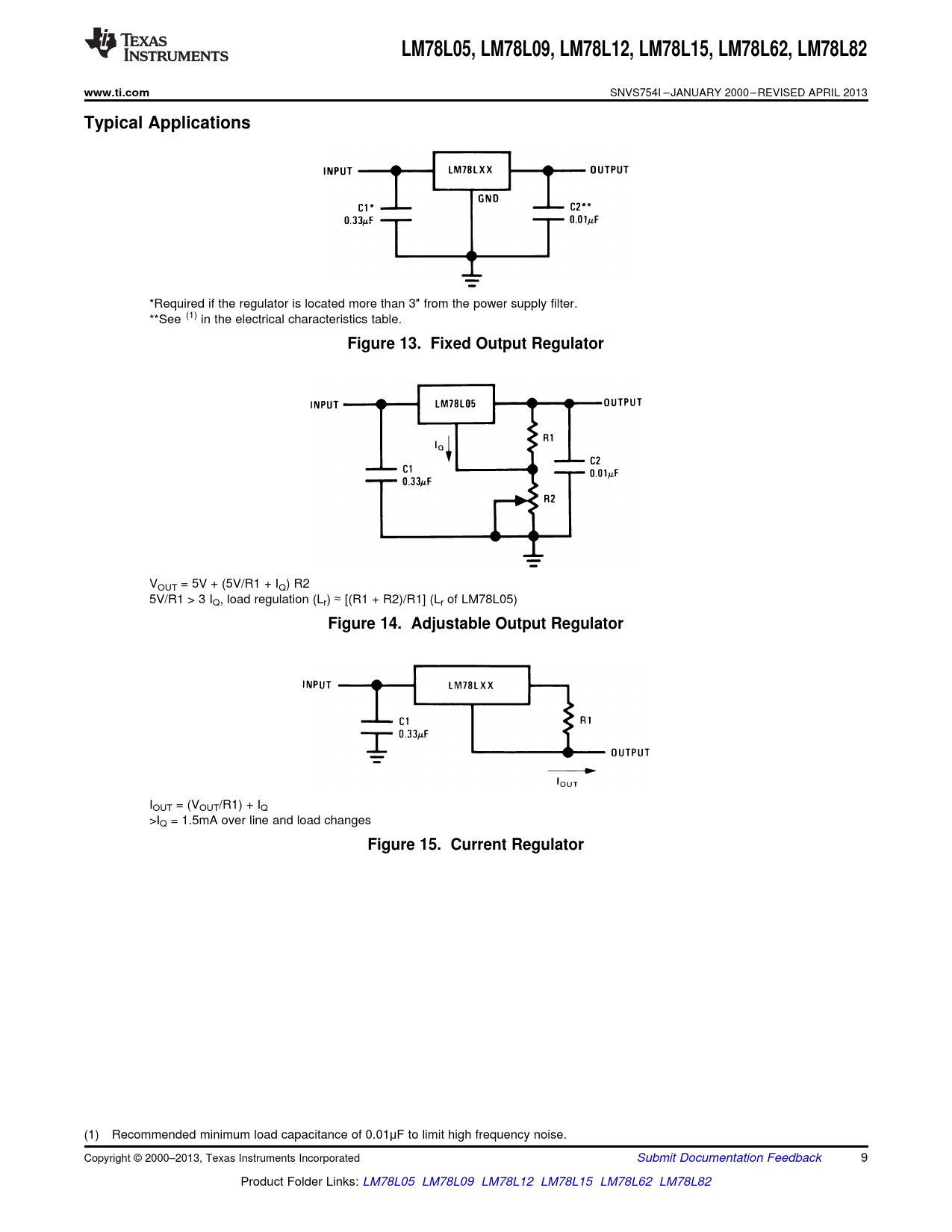 LM78L05. , LM78L09,. LM78L12. , LM78L15. , LM78L62,. LM78L82. www.ti.com. Typical Applications. Figure 13. Fixed Output Regulator