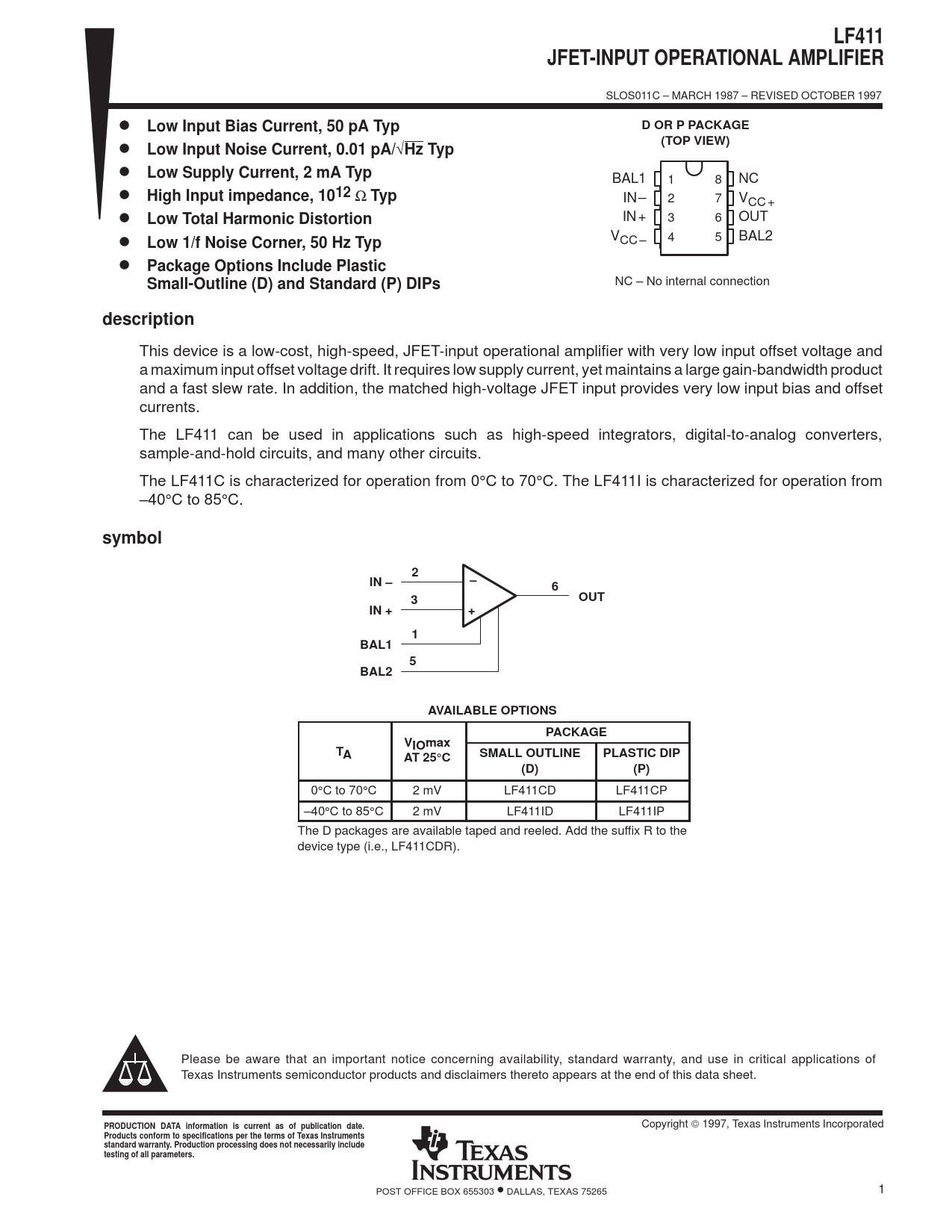 LF411JFET-INPUT OPERATIONAL AMPLIFIER SLOS011C – MARCH 1987 – REVISED OCTOBER 1997 D Low Input Bias Current, 50 pA TypD OR P PACKAGE D (TOP VIEW)Low Input Noise Current, 0.01 pA/ √ Hz Typ D Low Supply Current, 2 mA Typ BAL1 1 8 NC D High Input impedance, 1012 Ω Typ IN – 2 7 VCC+ D Low Total Harmonic Distortion IN + 3 6 OUT D Low 1/f Noise Corner, 50 Hz Typ V 4 5 CC – BAL2 D Package Options Include PlasticSmall-Outline (D) and Standard (P) DIPs NC – No internal connection description This device is a low-cost, high-speed, JFET-input operational amplifier with very low input offset voltage and a maximum input offset voltage drift. It requires low supply current, yet maintains a large gain-bandwidth product and a fast slew rate. In addition, the matched high-voltage JFET input provides very low input bias and offset currents. The LF411 can be used in applications such as high-speed integrators, digital-to-analog converters, sample-and-hold circuits, and many other circuits. The LF411C is characterized for operation from 0°C to 70°C. The LF411I is characterized for operation from –40°C to 85°C. symbol2–IN –6OUT3IN ++1BAL15BAL2AVAILABLE OPTIONSPACKAGEVIOVmaxIOTAAT 25 ° CSMALL OUTLINEPLASTIC DIP(D)(P) 0°C to 70°C 2 mV LF411CD LF411CP –40°C to 85°C 2 mV LF411ID LF411IP The D packages are available taped and reeled. Add the suffix R to the device type (i.e., LF411CDR). Please be aware that an important notice concerning availability, standard warranty, and use in critical applications of Texas Instruments semiconductor products and disclaimers thereto appears at the end of this data sheet. PRODUCTION DATA information is current as of publication date. Copyright 1997, Texas Instruments Incorporated Products conform to specifications per the terms of Texas Instruments standard warranty. Production processing does not necessarily include testing of all parameters. POST OFFICE BOX 655303 • DALLAS, TEXAS 75265 1