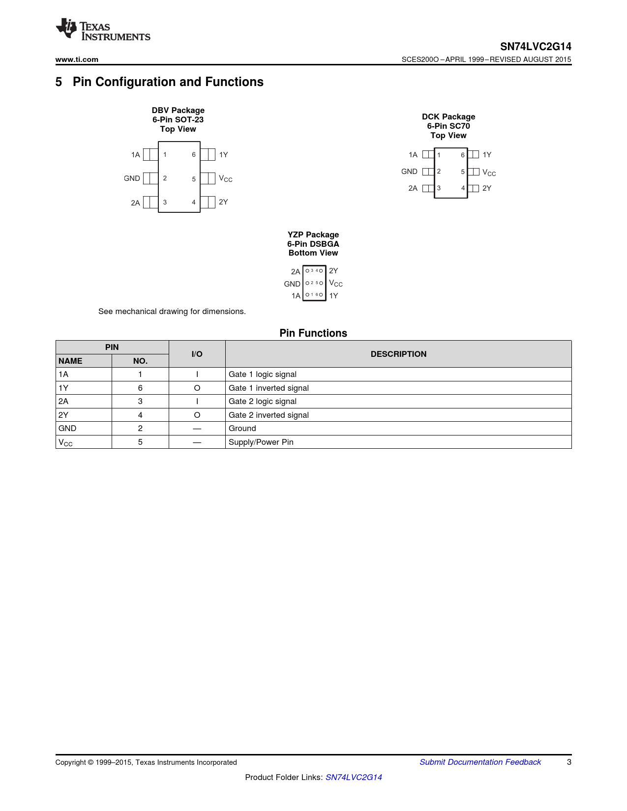 SN74LVC2G14. www.ti.com. 5 Pin Configuration and Functions. DBV Package. DCK Package. 6-Pin SOT-23. 6-Pin SC70. Top View