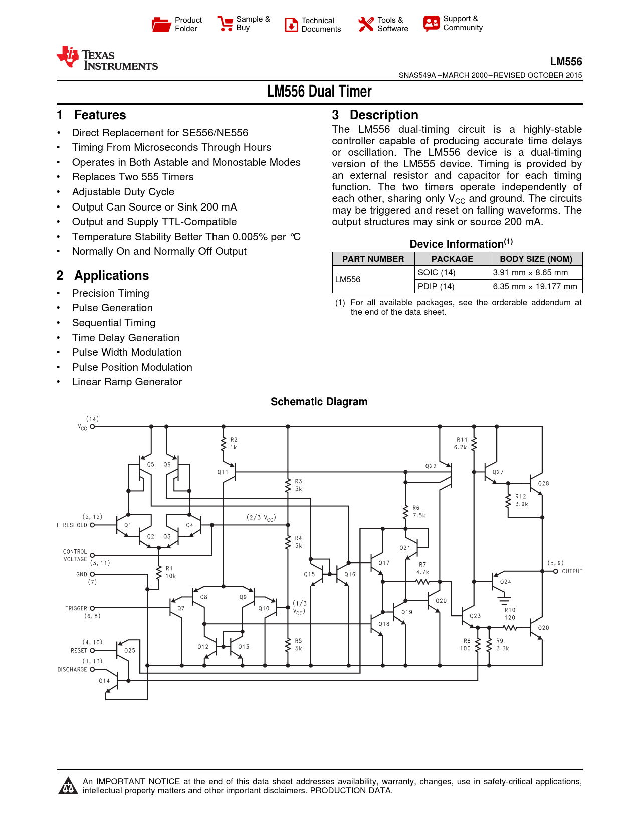 LM556. LM556 Dual Timer. 1 Features. 3 Description. Device Information(1). PART NUMBER. PACKAGE. BODY SIZE (NOM). 2 Applications