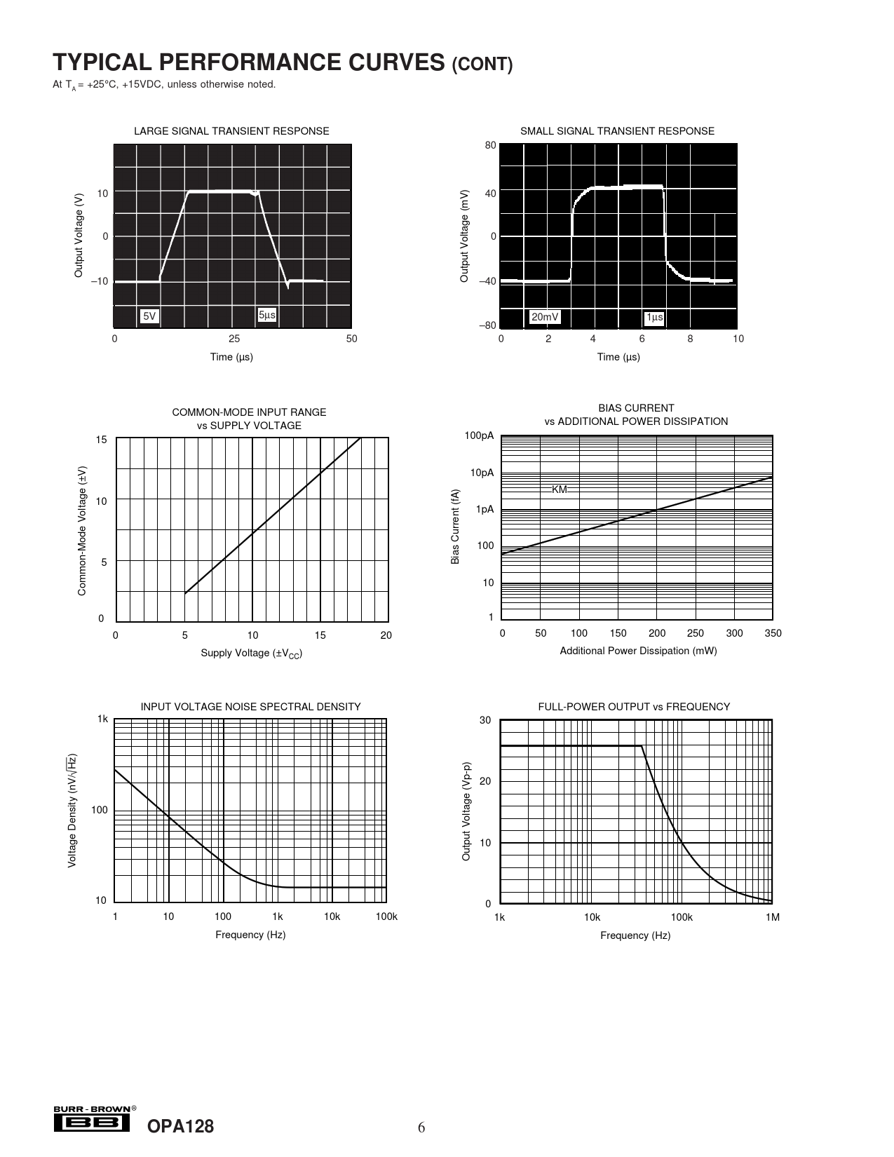 TYPICAL PERFORMANCE CURVES (CONT) At T = +25°C, +15VDC, unless otherwise noted. A LARGE SIGNAL TRANSIENT RESPONSE SMALL SIGNAL TRANSIENT RESPONSE 80 10 40 0 0 Output Voltage (V) Output Voltage (mV) –10 –40 5V 5µs 20mV 1µs –80 0 25 50 0 2 4 6 8 10 Time (µs) 5µs Time (µs) COMMON-MODE INPUT RANGE BIAS CURRENT vs SUPPLY VOLTAGE vs ADDITIONAL POWER DISSIPATION 15 100pA 10pA KM 10 1pA 100 5 Bias Current (fA) 10 Common-Mode Voltage (±V) 0 1 0 5 10 15 20 0 50 100 150 200 250 300 350 Supply Voltage (±V ) Additional Power Dissipation (mW) CC INPUT VOLTAGE NOISE SPECTRAL DENSITY FULL-POWER OUTPUT vs FREQUENCY 1k 30 20 100 10 Output Voltage (Vp-p) Voltage Density (nV/ Hz) 10 0 1 10 100 1k 10k 100k 1k 10k 100k 1M Frequency (Hz) Frequency (Hz) ® OPA128 6