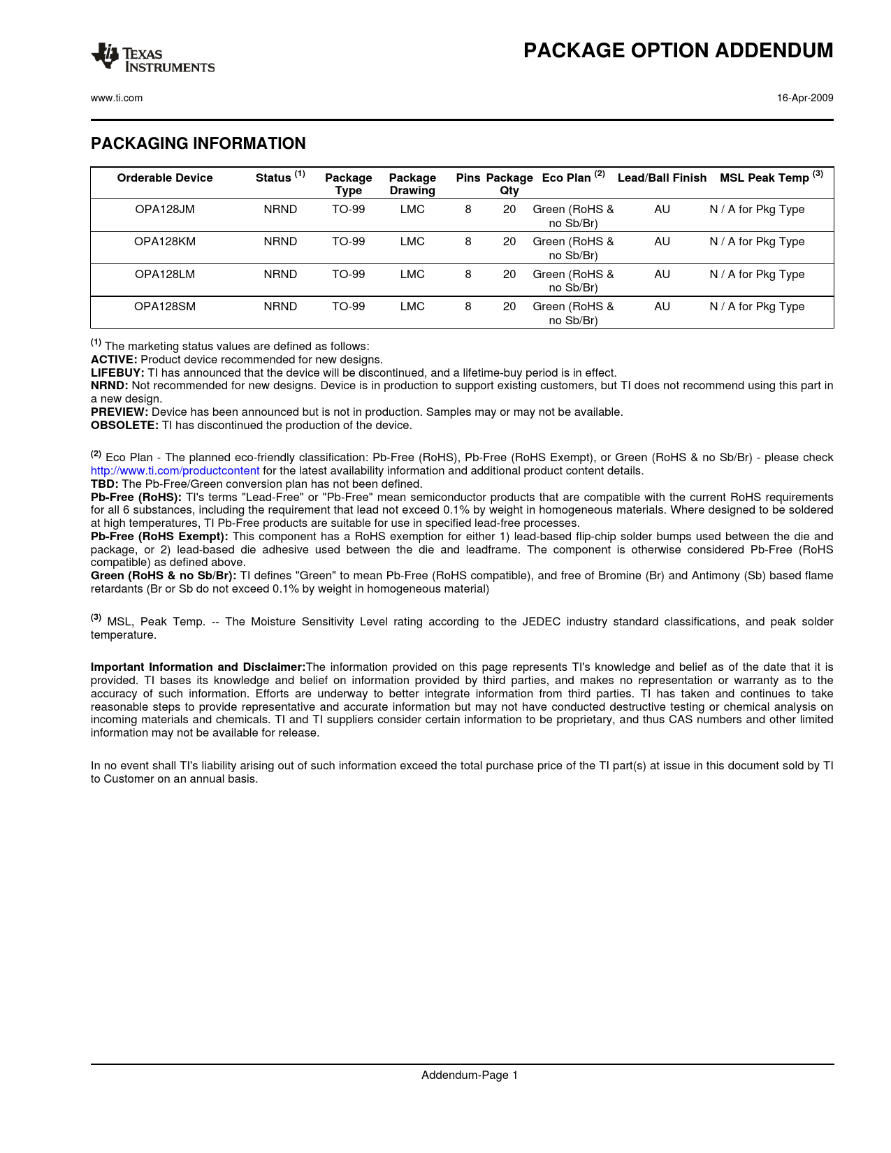 PACKAGE OPTION ADDENDUM www.ti.com 16-Apr-2009 PACKAGING INFORMATIONOrderable DeviceStatus (1)PackagePackagePins Package Eco Plan (2)Lead/Ball FinishMSL Peak Temp (3)TypeDrawingQty OPA128JM NRND TO-99 LMC 8 20 Green (RoHS & AU N / A for Pkg Type no Sb/Br) OPA128KM NRND TO-99 LMC 8 20 Green (RoHS & AU N / A for Pkg Type no Sb/Br) OPA128LM NRND TO-99 LMC 8 20 Green (RoHS & AU N / A for Pkg Type no Sb/Br) OPA128SM NRND TO-99 LMC 8 20 Green (RoHS & AU N / A for Pkg Type no Sb/Br) (1) The marketing status values are defined as follows: ACTIVE: Product device recommended for new designs. LIFEBUY: TI has announced that the device will be discontinued, and a lifetime-buy period is in effect. NRND: Not recommended for new designs. Device is in production to support existing customers, but TI does not recommend using this part in a new design. PREVIEW: Device has been announced but is not in production. Samples may or may not be available. OBSOLETE: TI has discontinued the production of the device. (2) Eco Plan - The planned eco-friendly classification: Pb-Free (RoHS), Pb-Free (RoHS Exempt), or Green (RoHS & no Sb/Br) - please check http://www.ti.com/productcontent for the latest availability information and additional product content details. TBD: The Pb-Free/Green conversion plan has not been defined. Pb-Free (RoHS): TI's terms "Lead-Free" or "Pb-Free" mean semiconductor products that are compatible with the current RoHS requirements for all 6 substances, including the requirement that lead not exceed 0.1% by weight in homogeneous materials. Where designed to be soldered at high temperatures, TI Pb-Free products are suitable for use in specified lead-free processes. Pb-Free (RoHS Exempt): This component has a RoHS exemption for either 1) lead-based flip-chip solder bumps used between the die and package, or 2) lead-based die adhesive used between the die and leadframe. The component is otherwise considered Pb-Free (RoHS compatible) as defined above. Green (RoHS & no Sb/Br): TI defines "Green" to mean Pb-Free (RoHS compatible), and free of Bromine (Br) and Antimony (Sb) based flame retardants (Br or Sb do not exceed 0.1% by weight in homogeneous material) (3) MSL, Peak Temp. -- The Moisture Sensitivity Level rating according to the JEDEC industry standard classifications, and peak solder temperature. Important Information and Disclaimer: The information provided on this page represents TI's knowledge and belief as of the date that it is provided. TI bases its knowledge and belief on information provided by third parties, and makes no representation or warranty as to the accuracy of such information. Efforts are underway to better integrate information from third parties. TI has taken and continues to take reasonable steps to provide representative and accurate information but may not have conducted destructive testing or chemical analysis on incoming materials and chemicals. TI and TI suppliers consider certain information to be proprietary, and thus CAS numbers and other limited information may not be available for release. In no event shall TI's liability arising out of such information exceed the total purchase price of the TI part(s) at issue in this document sold by TI to Customer on an annual basis. Addendum-Page 1