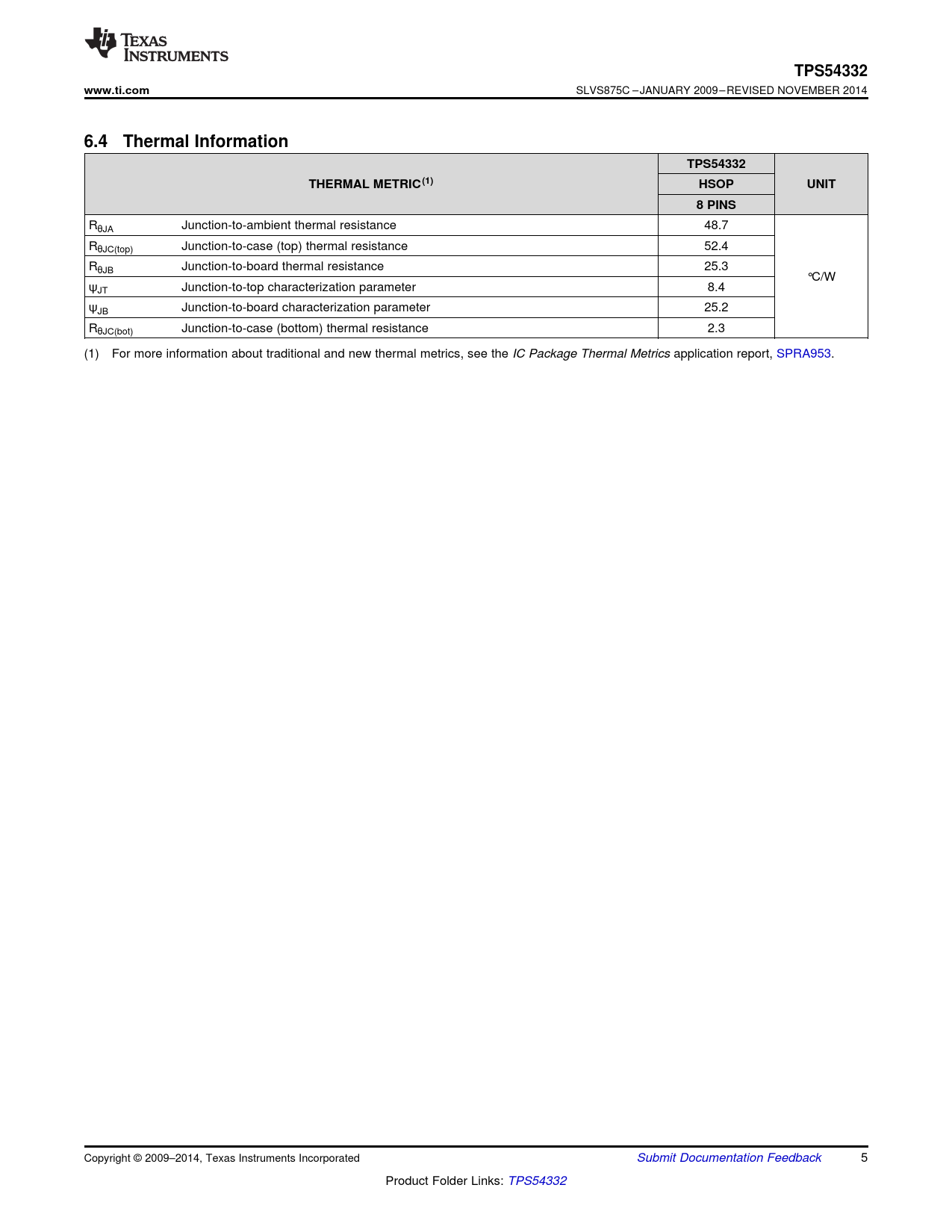TPS54332. www.ti.com. 6.4 Thermal Information. THERMAL METRIC(1). HSOP. UNIT. 8 PINS