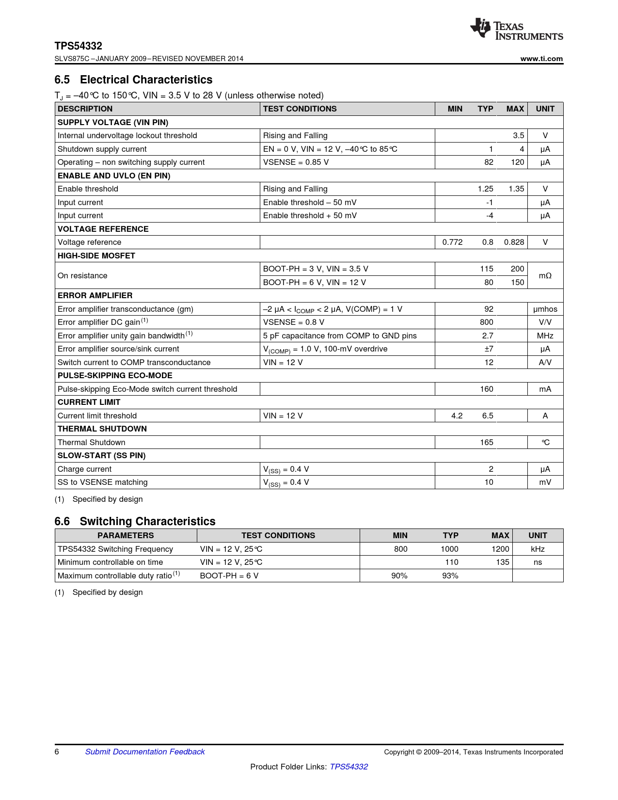 TPS54332. www.ti.com. 6.5 Electrical Characteristics. DESCRIPTION. TEST CONDITIONS. MIN. TYP. MAX. UNIT. SUPPLY VOLTAGE (VIN PIN)