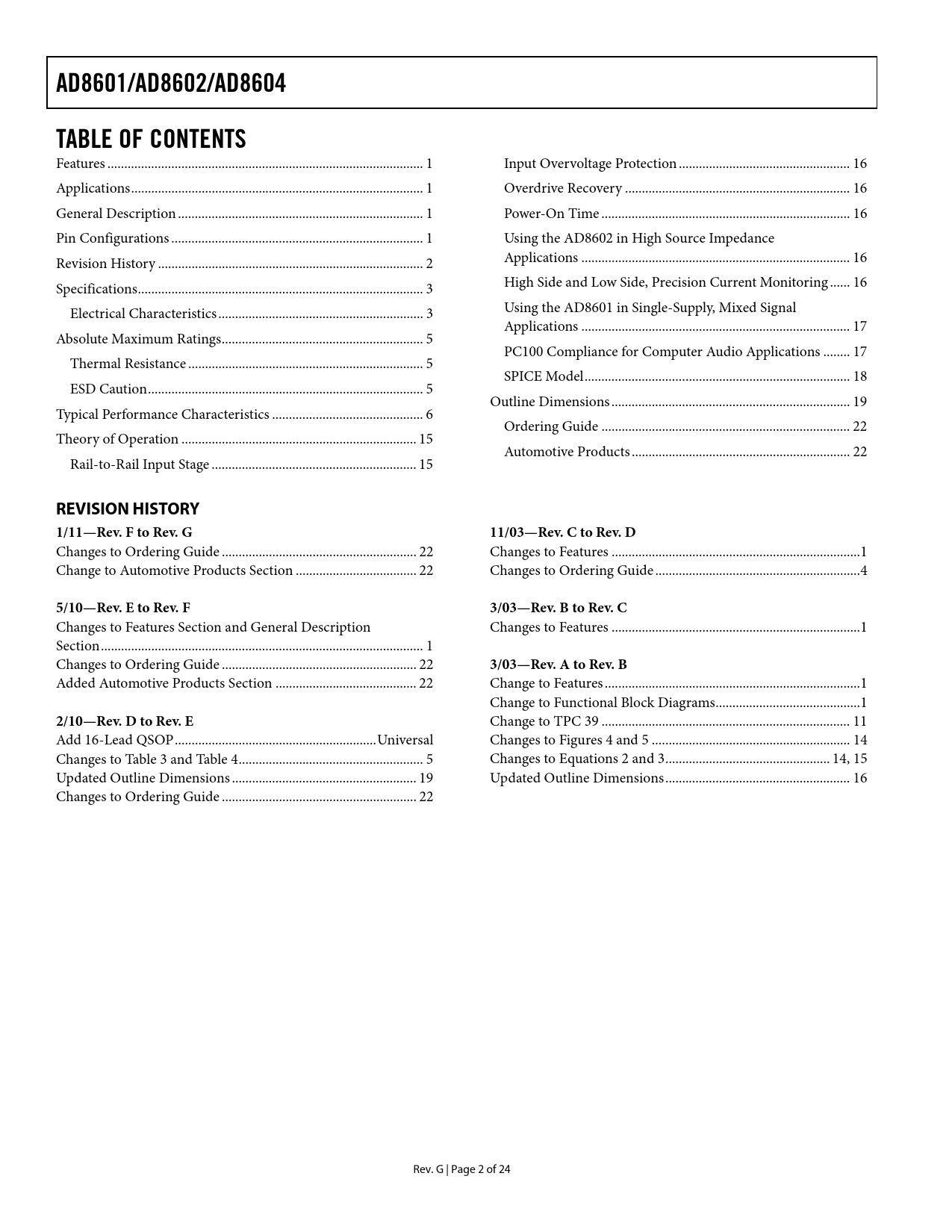 link to page 1 link to page 1 link to page 1 link to page 1 link to page 2 link to page 3 link to page 3 link to page 5 link to page 5 link to page 5 link to page 6 link to page 15 link to page 15 link to page 16 link to page 16 link to page 16 link to page 16 link to page 16 link to page 16 link to page 17 link to page 17 link to page 17 link to page 18 link to page 19 link to page 22 link to page 22 AD8601/AD8602/AD8604TABLE OF CONTENTS Features .. 1 Input Overvoltage Protection ... 16 Applications... 1 Overdrive Recovery ... 16 General Description ... 1 Power-On Time .. 16 Pin Configurations ... 1 Using the AD8602 in High Source Impedance Revision History ... 2 Applications .. 16 Specifications... 3 High Side and Low Side, Precision Current Monitoring .. 16 Electrical Characteristics... 3 Using the AD8601 in Single-Supply, Mixed Signal Applications .. 17 Absolute Maximum Ratings.. 5 PC100 Compliance for Computer Audio Applications .. 17 Thermal Resistance .. 5 SPICE Model... 18 ESD Caution.. 5 Outline Dimensions ... 19 Typical Performance Characteristics ... 6 Ordering Guide .. 22 Theory of Operation .. 15 Automotive Products ... 22 Rail-to-Rail Input Stage ... 15 REVISION HISTORY1/11—Rev. F to Rev. G11/03—Rev. C to Rev. D Changes to Ordering Guide .. 22 Changes to Features ..1 Change to Automotive Products Section .. 22 Changes to Ordering Guide ...4 5/10—Rev. E to Rev. F3/03—Rev. B to Rev. C Changes to Features Section and General Description Changes to Features ..1 Section.. 1 Changes to Ordering Guide .. 22 3/03—Rev. A to Rev. B Added Automotive Products Section .. 22 Change to Features ..1 Change to Functional Block Diagrams...1 2/10—Rev. D to Rev. E Change to TPC 39 .. 11 Add 16-Lead QSOP..Universal Changes to Figures 4 and 5 ... 14 Changes to Table 3 and Table 4... 5 Changes to Equations 2 and 3... 14, 15 Updated Outline Dimensions ... 19 Updated Outline Dimensions... 16 Changes to Ordering Guide .. 22 Rev. G | Page 2 of 24 Document Outline FEATURES APPLICATIONS GENERAL DESCRIPTION PIN CONFIGURATIONS TABLE OF CONTENTS REVISION HISTORY SPECIFICATIONS ELECTRICAL CHARACTERISTICS ABSOLUTE MAXIMUM RATINGS THERMAL RESISTANCE ESD CAUTION TYPICAL PERFORMANCE CHARACTERISTICS THEORY OF OPERATION RAIL-TO-RAIL INPUT STAGE INPUT OVERVOLTAGE PROTECTION OVERDRIVE RECOVERY POWER-ON TIME USING THE AD8602 IN HIGH SOURCE IMPEDANCE APPLICATIONS HIGH SIDE AND LOW SIDE, PRECISION CURRENT MONITORING USING THE AD8601 IN SINGLE-SUPPLY, MIXED SIGNAL APPLICATIONS PC100 COMPLIANCE FOR COMPUTER AUDIO APPLICATIONS SPICE MODEL OUTLINE DIMENSIONS ORDERING GUIDE AUTOMOTIVE PRODUCTS