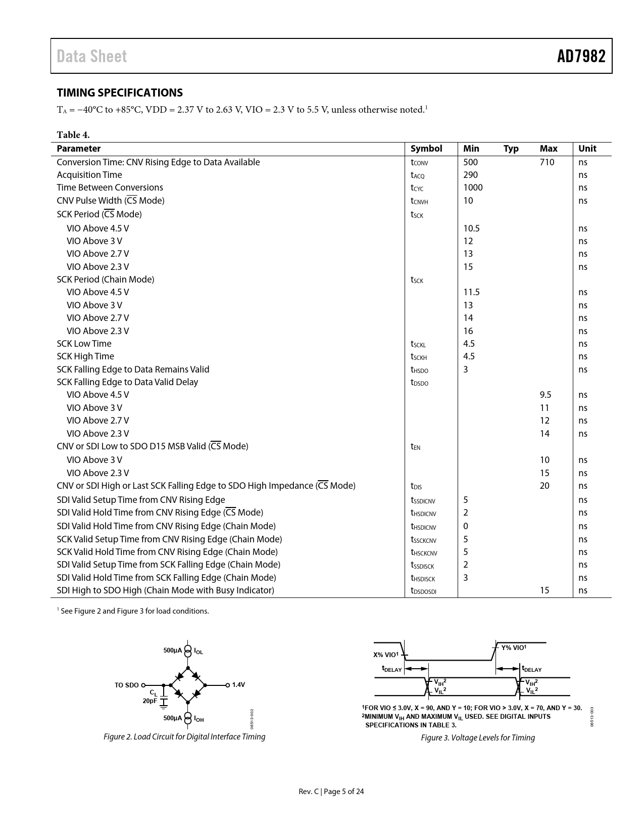 Data Sheet. AD7982. TIMING SPECIFICATIONS. Table 4. Parameter. Symbol Min Typ Max Unit. 500µA. Y% VIO1. X% VIO1. tDELAY. V 2. TO SDO. 1.4V. VIH