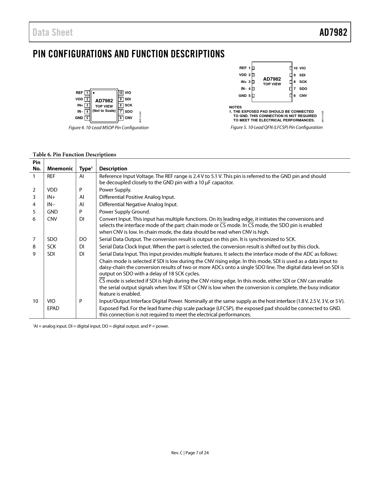 REF 110 VIOVDD 29SDIAD7982IN+ 38SCKTOP VIEWIN– 47SDOREF110 VIOGND 56CNVVDD29SDIAD7982IN+38SCKTOP VIEWNOTESIN– 4(Not to Scale)7SDO 4 5 1. THE EXPOSED PAD SHOULD BE CONNECTED 0 0 0 0 - - TO GND. THIS CONNECTION IS NOT REQUIRED 3 GND 3 56CNV 1 1 5 5 6 6 TO MEET THE ELECTRICAL PERFORMANCES. 0 0 Document Outline Features Applications Application Diagram Example General Description Table of Contents Revision History Specifications Timing Specifications Absolute Maximum Ratings ESD Caution Pin Configurations and Function Descriptions Terminology Typical Performance Characteristics Theory of Operation Circuit Information Converter Operation Transfer Functions Typical Connection Diagram Analog Inputs Driver Amplifier Choice Single-to-Differential Driver Voltage Reference Input Power Supply Digital Interface CS Mode, 3-Wire Without Busy Indicator CS Mode, 3-Wire with Busy Indicator CS Mode, 4-Wire Without Busy Indicator CS Mode, 4-Wire with Busy Indicator Chain Mode Without Busy Indicator Chain Mode with Busy Indicator Application Hints Layout Evaluating AD7982 Performance Outline Dimensions Ordering Guide