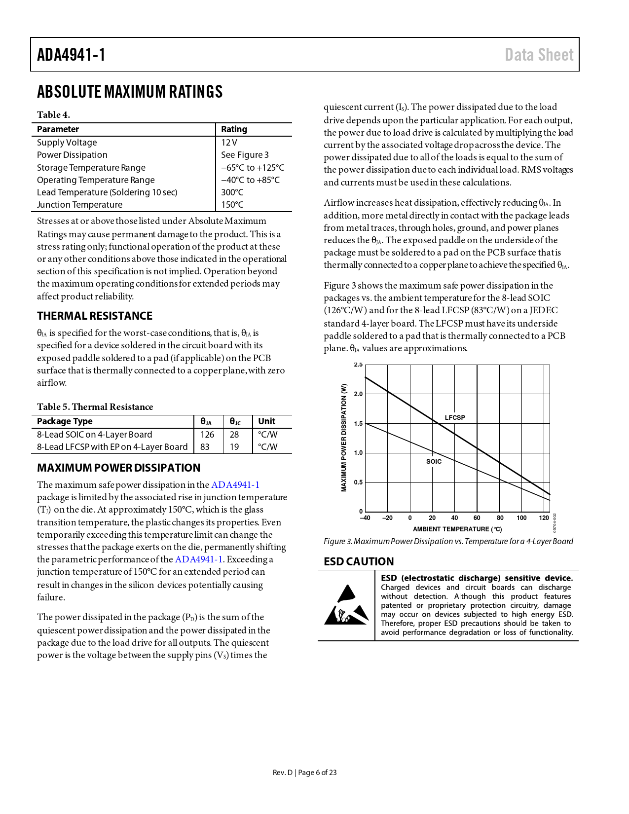 ADA4941-1 Data Sheet ABSOLUTE MAXIMUM RATINGS Table 4 Parameter Rating THERMAL RESISTANCE 2.5 2.0 Table 5 Thermal Resistance