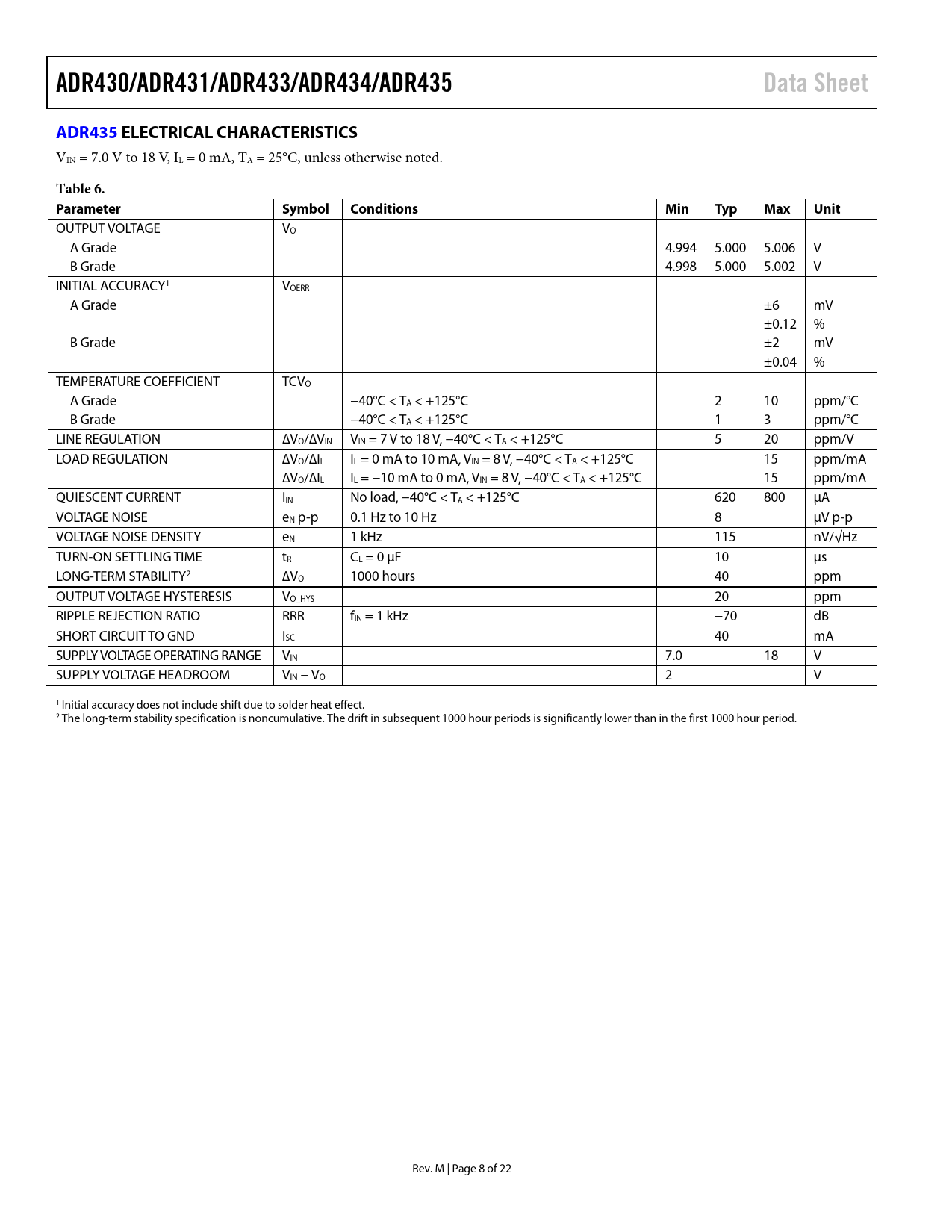 OUTPUT VOLTAGE VO A Grade 4.994 5.000 5.006 V B Grade 4.998 5.000 5.002 V INITIAL ACCURACY1 VOERR A Grade ±6 mV ±0.12 % B Grade ±2 mV ±0.04 % TEMPERATURE COEFFICIENT TCVO A Grade −40°C < TA < +125°C 2 10 ppm/°C B Grade −40°C < TA < +125°C 1 3 ppm/°C LINE REGULATION ∆VO/∆VIN VIN = 7 V to 18 V, −40°C < TA < +125°C 5 20 ppm/V LOAD REGULATION ∆VO/∆IL IL = 0 mA to 10 mA, VIN = 8 V, −40°C < TA < +125°C 15 ppm/mA ∆VO/∆IL IL = −10 mA to 0 mA, VIN = 8 V, −40°C < TA < +125°C 15 ppm/mA QUIESCENT CURRENT IIN No load, −40°C < TA < +125°C 620 800 µA VOLTAGE NOISE eN p-p 0.1 Hz to 10 Hz 8 µV p-p VOLTAGE NOISE DENSITY eN 1 kHz 115 nV/√Hz TURN-ON SETTLING TIME tR CL = 0 µF 10 µs LONG-TERM STABILITY2 ∆VO 1000 hours 40 ppm OUTPUT VOLTAGE HYSTERESIS VO_HYS 20 ppm RIPPLE REJECTION RATIO RRR fIN = 1 kHz −70 dB SHORT CIRCUIT TO GND ISC 40 mA SUPPLY VOLTAGE OPERATING RANGE VIN 7.0 18 V SUPPLY VOLTAGE HEADROOM VIN − VO 2 V 1 Initial accuracy does not include shift due to solder heat effect. 2 The long-term stability specification is noncumulative. The drift in subsequent 1000 hour periods is significantly lower than in the first 1000 hour period. Rev. M | Page 8 of 22 Document Outline Features Applications Pin Configurations General Description Table of Contents Revision History Specifications ADR430 Electrical Characteristics ADR431 Electrical Characteristics ADR433 Electrical Characteristics ADR434 Electrical Characteristics ADR435 Electrical Characteristics Absolute Maximum Ratings Thermal Resistance ESD Caution Typical Performance Characteristics Theory of Operation Basic Voltage Reference Connections Noise Performance High Frequency Noise Turn-On Time Applications Information Output Adjustment Reference for Converters in Optical Network Control Circuits High Voltage Floating Current Source Kelvin Connection Dual Polarity References Programmable Current Source Programmable DAC Reference Voltage Precision Voltage Reference for Data Converters Precision Boosted Output Regulator Outline Dimensions Ordering Guide